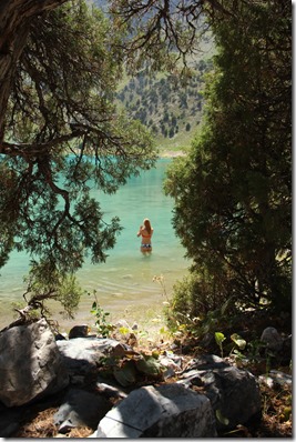 Вода в Кулікалонському озері така ж холодна, як учора на озері Чукурак, але й сонце на цій висоті вже дурне - волосся після купання в озері висохло за кілька хвилин. Поки купались в озері, зібрали навколо гурт дітвори з пастуших наметів. Якщо точніше, хлопчаки бігали заглядати за нашими дівчатами в купальниках - таке видовище ім рідко доводиться бачити. Місцеві жінки виглядають достатньо “традиційно” - в довгих сукнях й хустках, й у цілому місцеве населення достатньо консервативне, часто трапляються тюбетейки, халати, шаровари, мусульманські бороди. В таких суспільствах, незважаючи на поверхневу “радянизацію”, у жінок дуже обмежені можливості вести себе, як їм захочеться - наприклад, засмагати й купатись на пляжі. На щастя, мова не про всю країну - моя знайома Ойна з Душанбе цілком собі сучасна дівчина, яка не соромиться маєчок й коротких спідниць. Але то столиця, гірські ж суспільства усюди дуже консервативні, а в “глибинах” Центральної Азії, тим паче, Ввечері Тахір таки підтвердив, що місцевим жінкам й дівчатам купатись в озерах у них не можна.